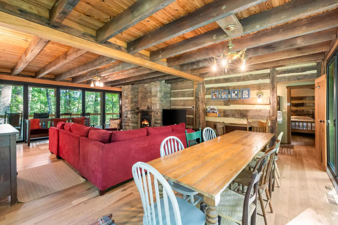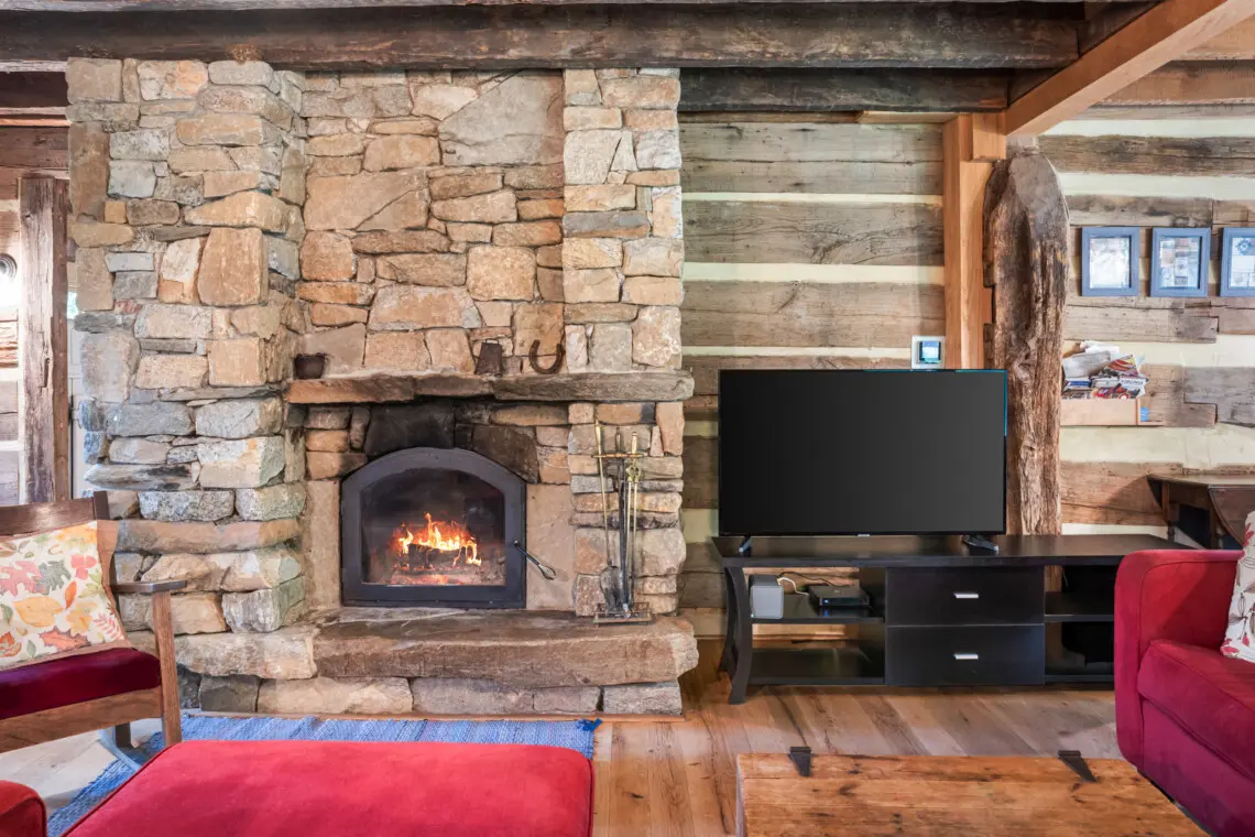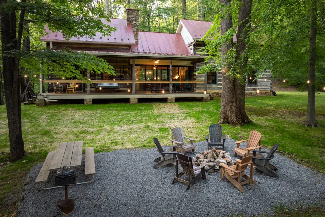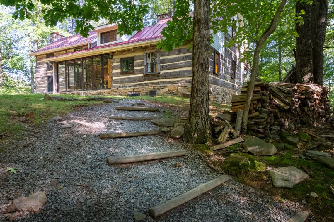 Escape the heat of the city and suburbia for cooler fresh mountain air, mature forest canopy, historic ambiance, and a stone firepit surrounded by Adirondack chairs. Firewood provided. Coffee klatch with friends and family mornings on the wide open porch, forest bath afternoons, grill and barbeque evenings near the fire. Notice migrating and resident birds in the tree canopy. This is a unique experience in a Blue Ridge Mountains historic restored 1880’s log cabin, surrounded by 400+ acres of mature forest in this robust frontier setting near Charlottesville. Enjoy a week or long weekend with family and friends in this authentic restored 1880’s dogtrot “double” log cabin – joined by a great room that has folding glass walls. (There is whole house central Air Conditioning and Heating, FYI.) WIFI, WIFI Calling, and satellite TV included.