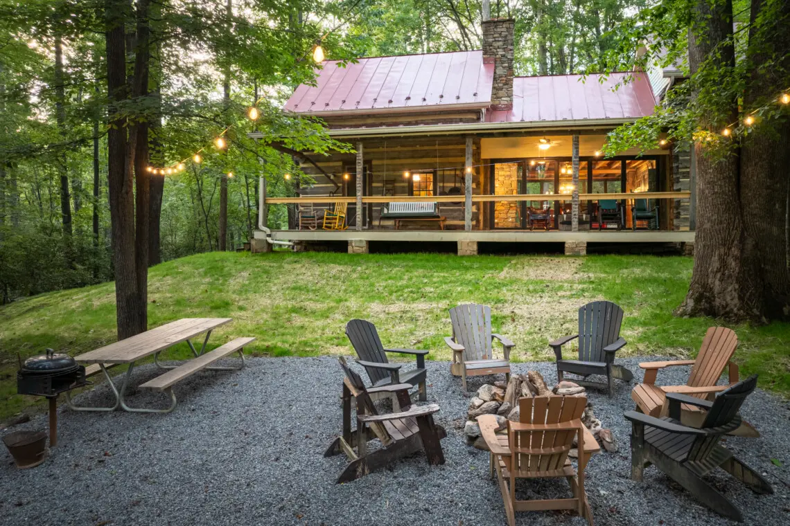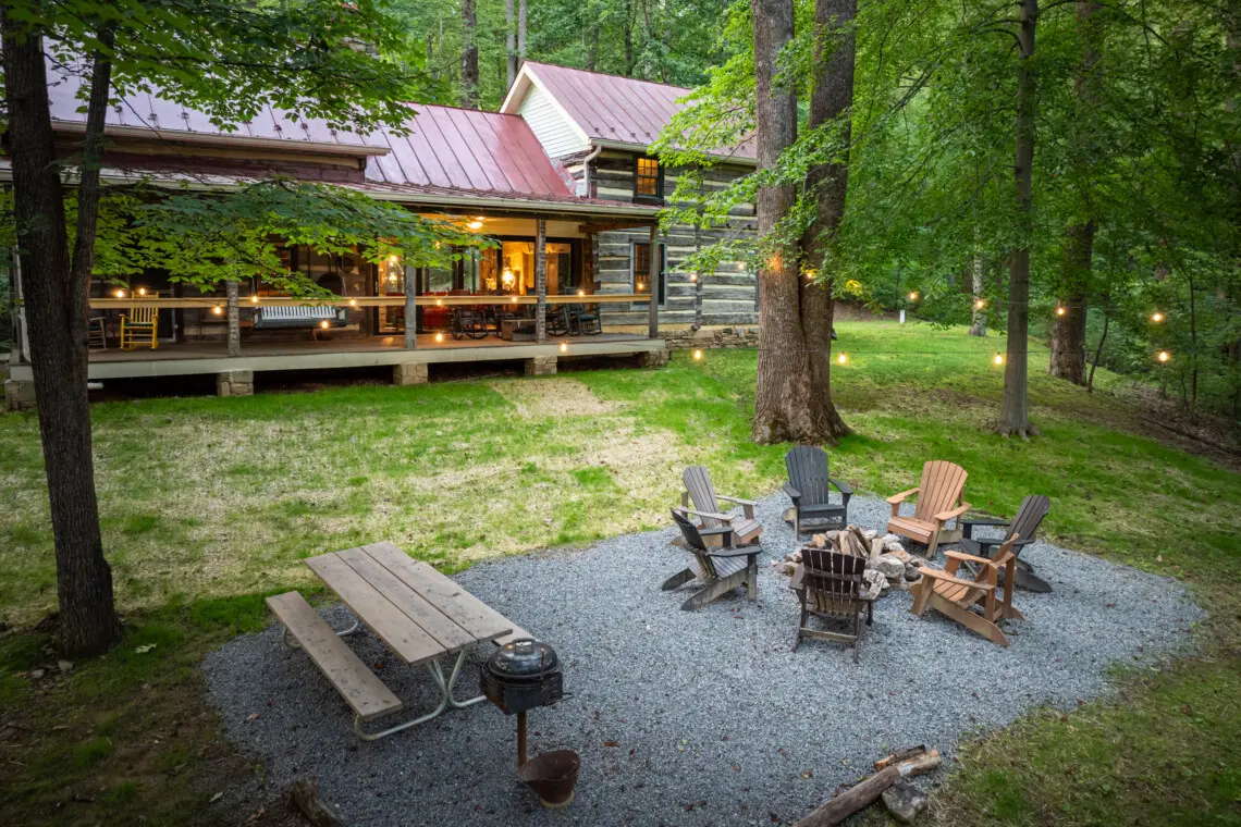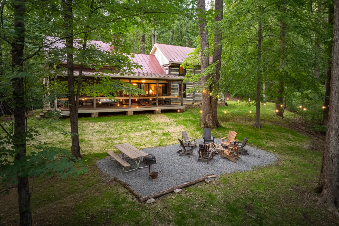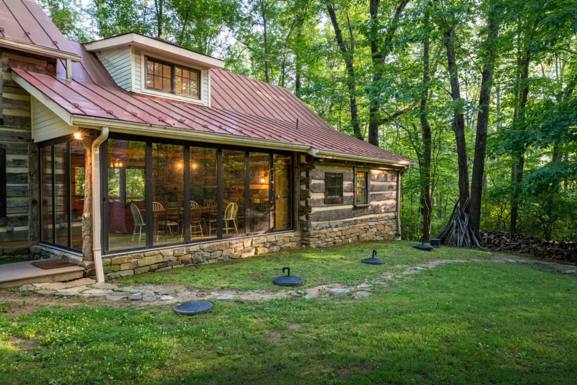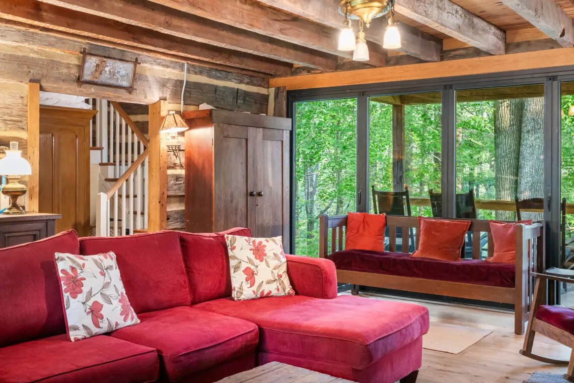 Escape the heat of the city and suburbia for cooler fresh mountain air, mature forest canopy, historic ambiance, and a stone firepit surrounded by Adirondack chairs. Firewood provided. Coffee klatch with friends and family mornings on the wide open porch, forest bath afternoons, grill and barbeque evenings near the fire. Notice migrating and resident birds in the tree canopy. This is a unique experience in a Blue Ridge Mountains historic restored 1880’s log cabin, surrounded by 400+ acres of mature forest in this robust frontier setting near Charlottesville. Enjoy a week or long weekend with family and friends in this authentic restored 1880’s dogtrot “double” log cabin – joined by a great room that has folding glass walls. (There is whole house central Air Conditioning and Heating, FYI.) WIFI, WIFI Calling, and satellite TV included.