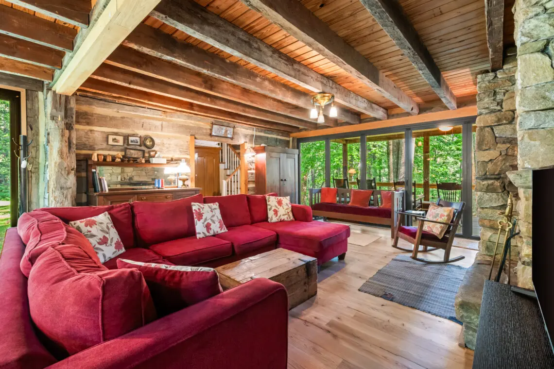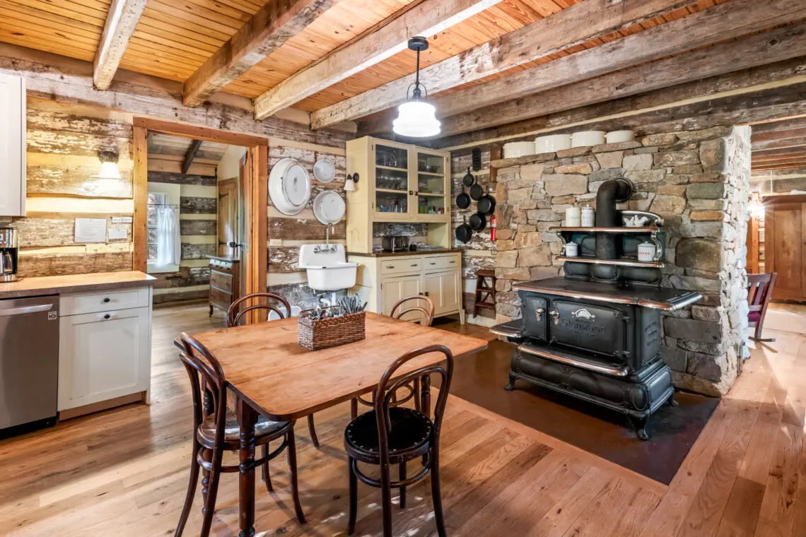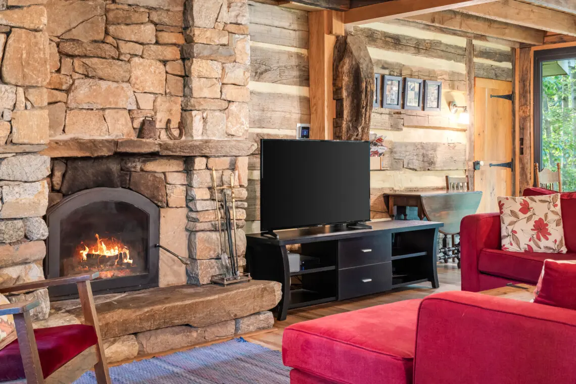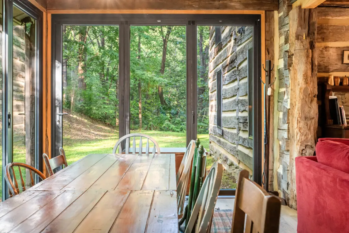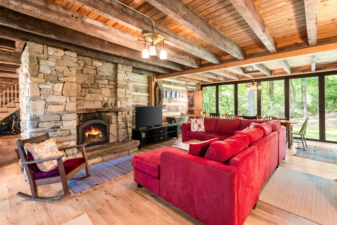 Immerse yourself in the ambiance of yesteryear on 400 mountainside forested acres. Hand hewn chestnut logs, reclaimed wood floors, restored antique stoves, furniture, and claw-foot tubs, – all contribute to the historic atmosphere, while folding glass walls, spacious rooms, central heating and air conditioning, and modern appliances provide the comfort and ease of modern day life.