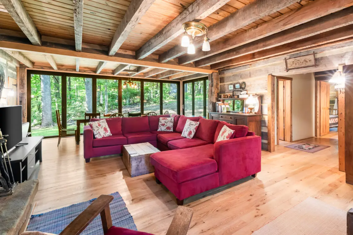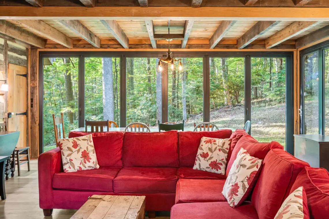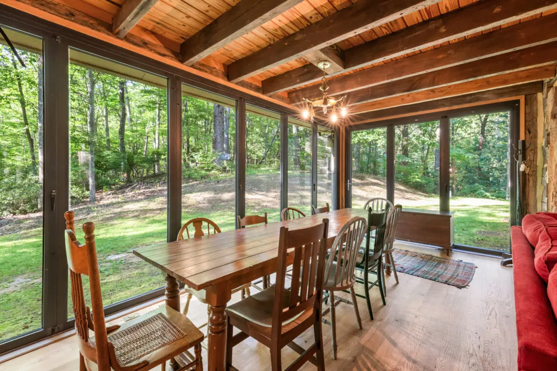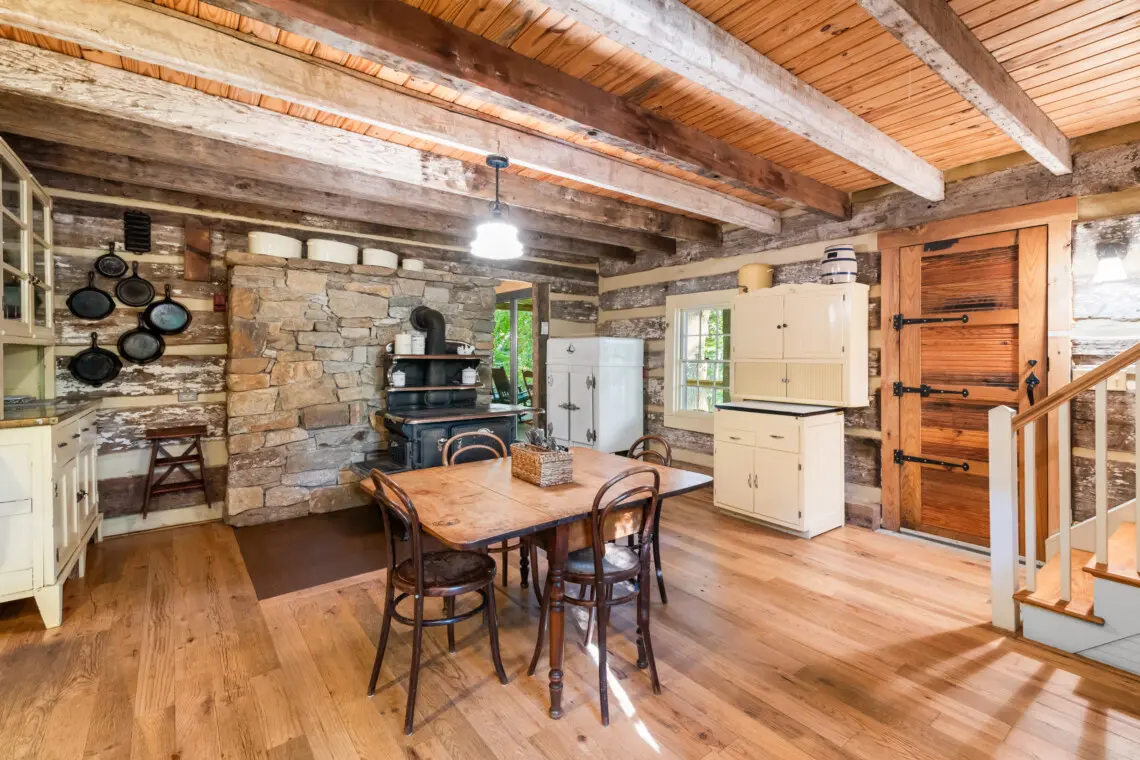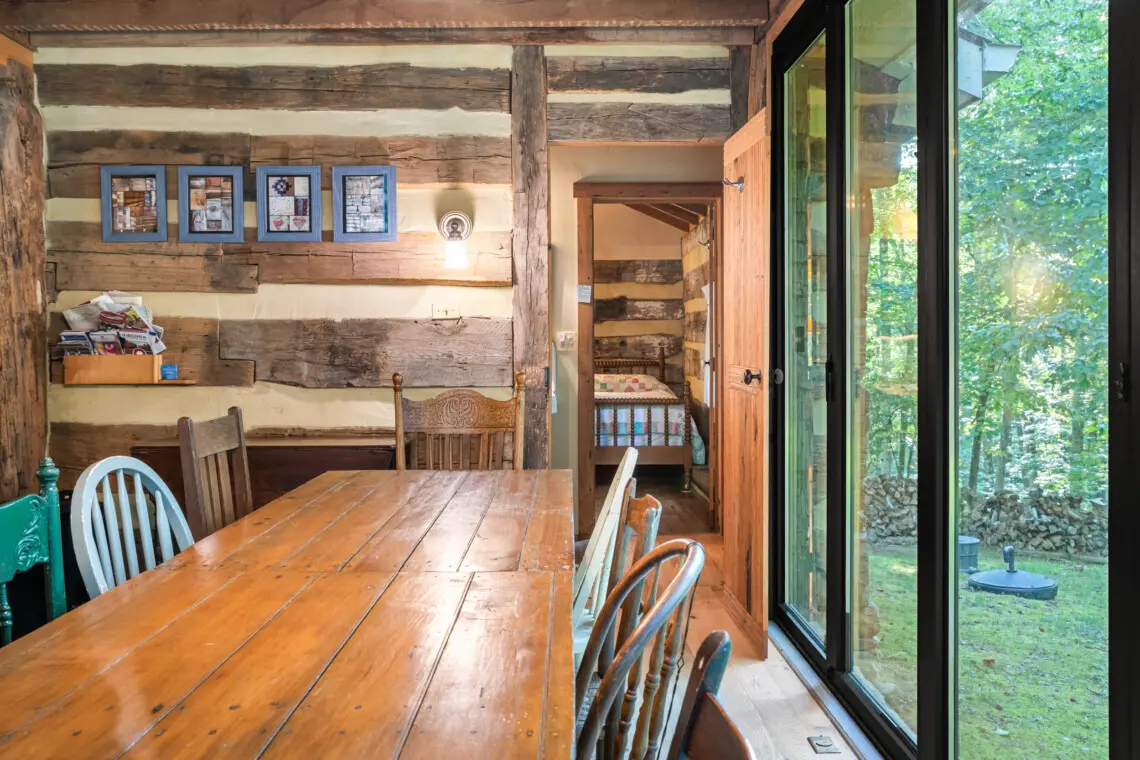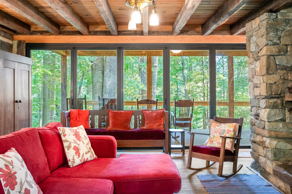 Immerse yourself in the ambiance of yesteryear on 400 mountainside forested acres. Hand hewn chestnut logs, reclaimed wood floors, restored antique stoves, furniture, and claw-foot tubs, – all contribute to the historic atmosphere, while folding glass walls, spacious rooms, central heating and air conditioning, and modern appliances provide the comfort and ease of modern day life.