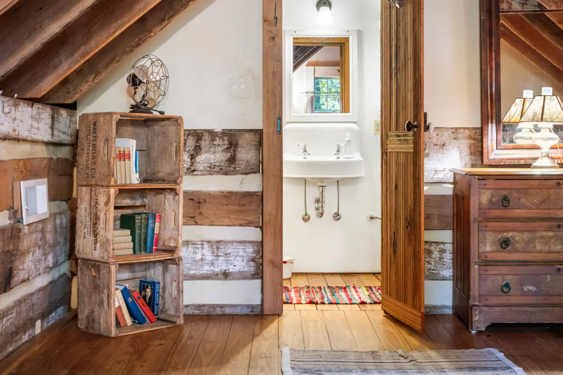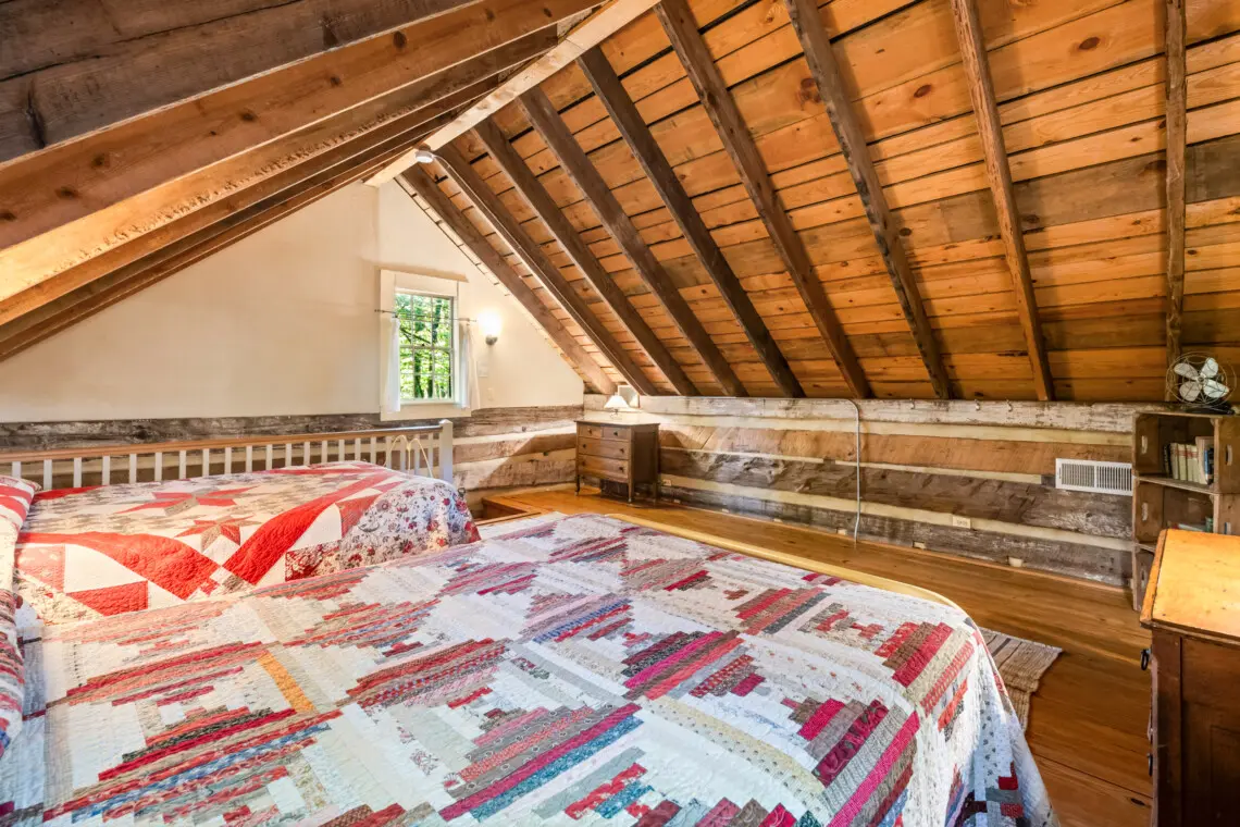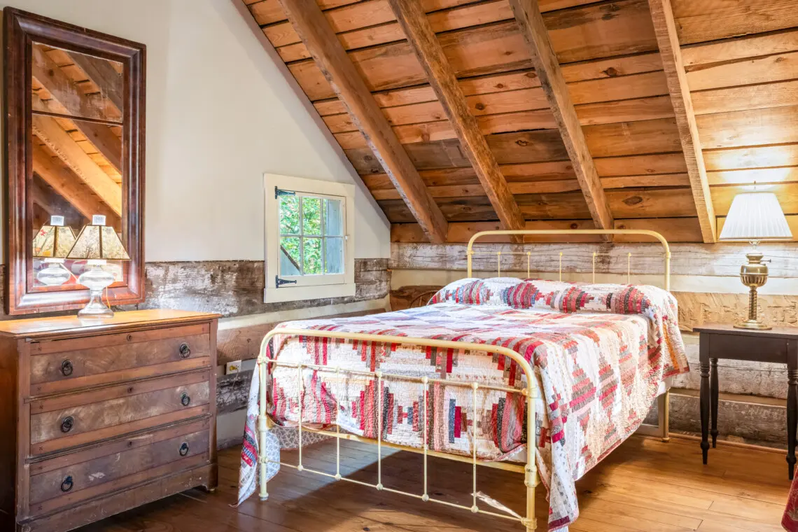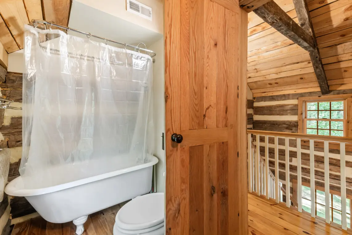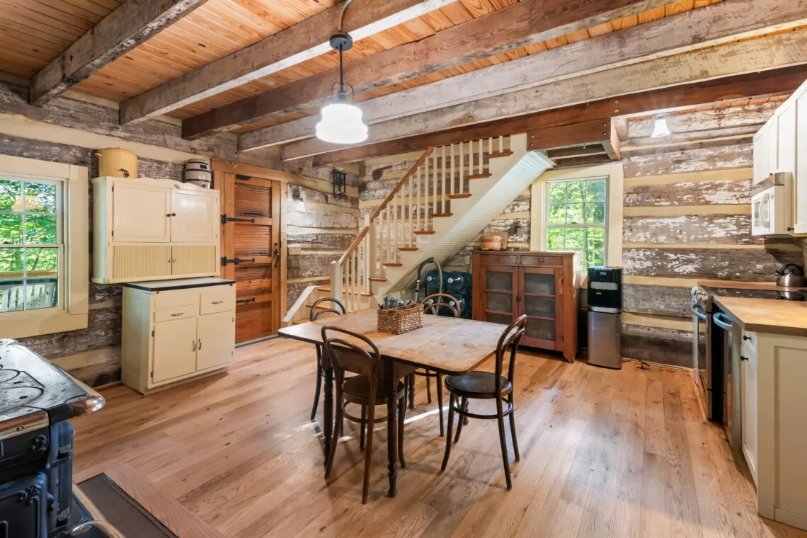 Immerse yourself in the ambiance of yesteryear on 400 mountainside forested acres. Hand hewn chestnut logs, reclaimed wood floors, restored antique stoves, furniture, and claw-foot tubs, – all contribute to the historic atmosphere, while folding glass walls, spacious rooms, central heating and air conditioning, and modern appliances provide the comfort and ease of modern day life.