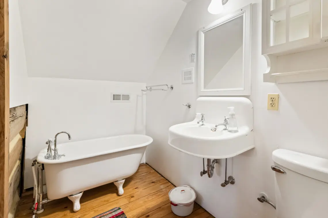 Bathrooms furnished with restored cast-iron sinks and claw-foot tub showers, and modern water-saving toilets.