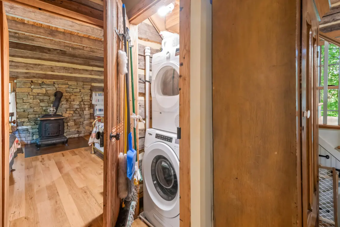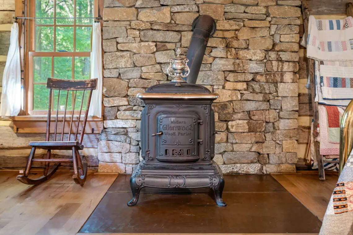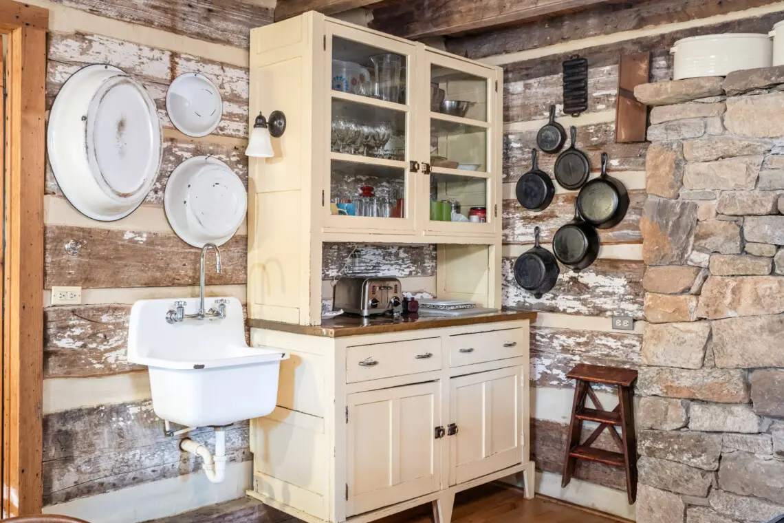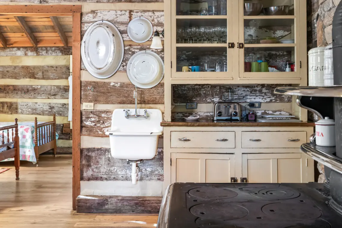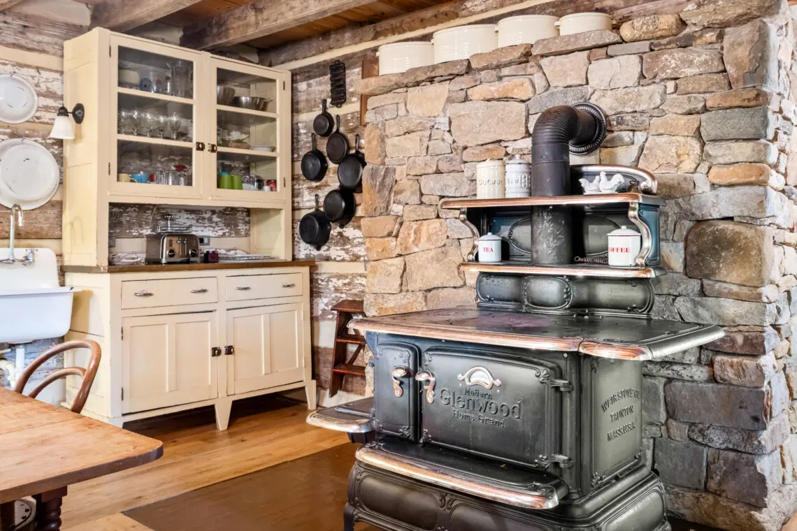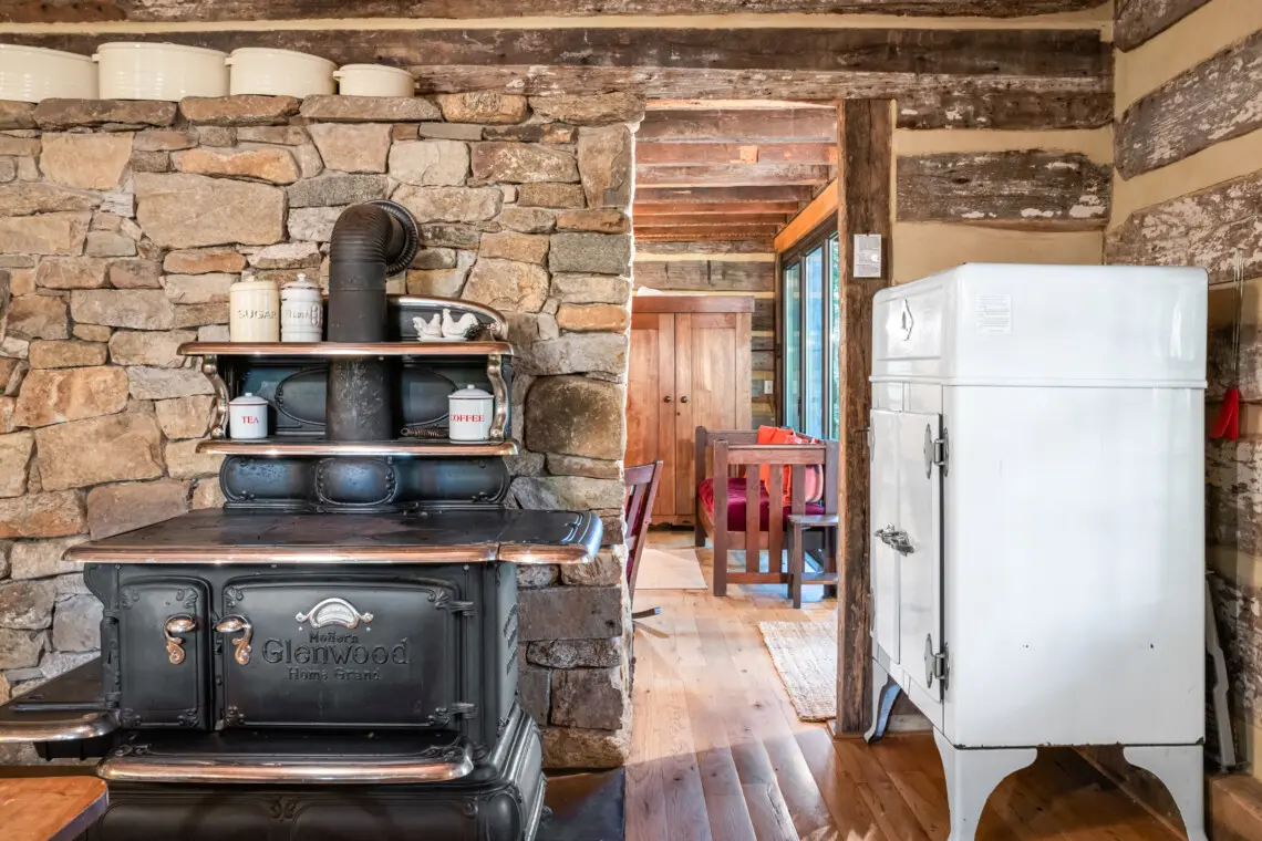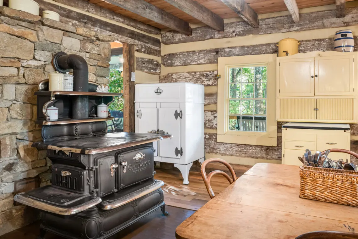 The kitchen has modern appliances; electric range/oven, microwave, two standard drip coffee makers, an antique electric refrigerator, a freezer (plus an antique wood cook stove for the adventurous sort – though best used for ambiance on a cool morning while bonding over your morning coffee). The kitchen is arranged as the early kitchens were, with the table in the middle of the room.